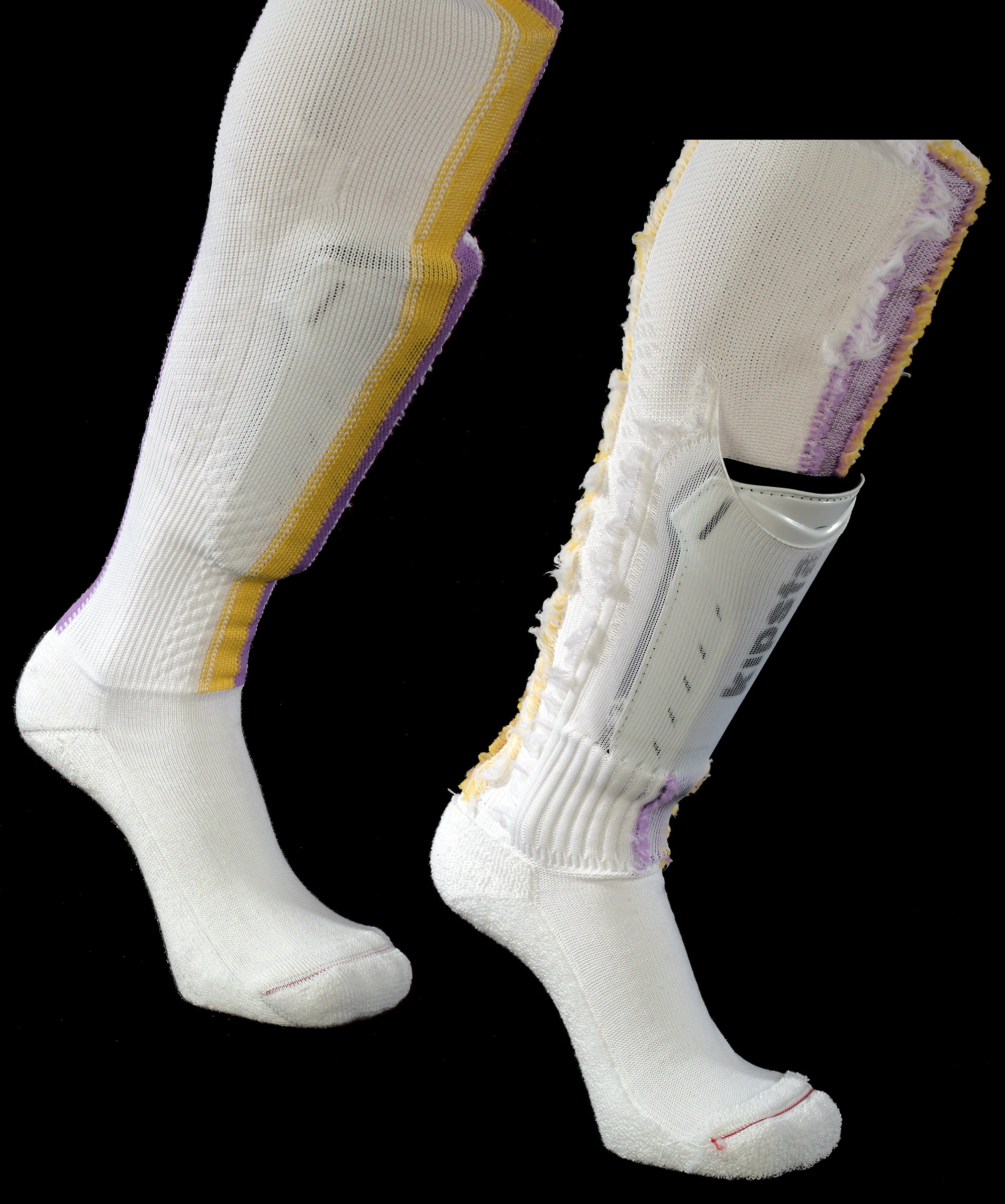 Si possono realizzare tasche interne alla calza come per esempio questa tasca porta parastinchi applicata ad una calza da calcio.