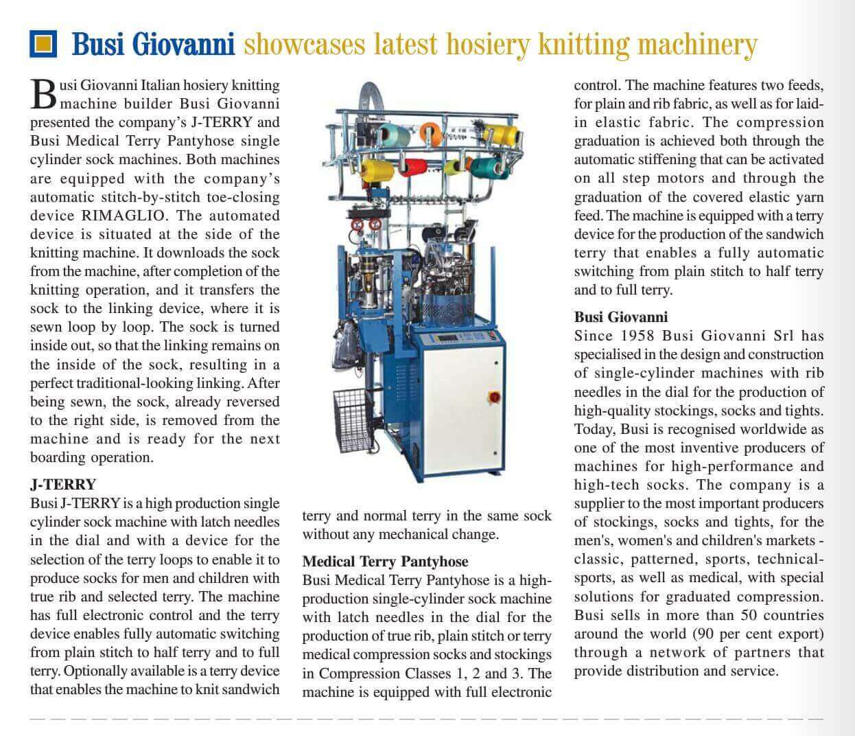 Busi Giovanni Italian hosiery knitting machine builder Busi Giovanni presented the company's J-TERRY and Busi Medical Terry Pantyhose single cylinder sock machines...